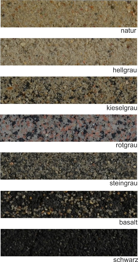 Diese Farben sind als Standard-Farbton lieferbar: natur, hellgrau, kieselgrau, rotgrau, steingrau, basalt und schwarz.